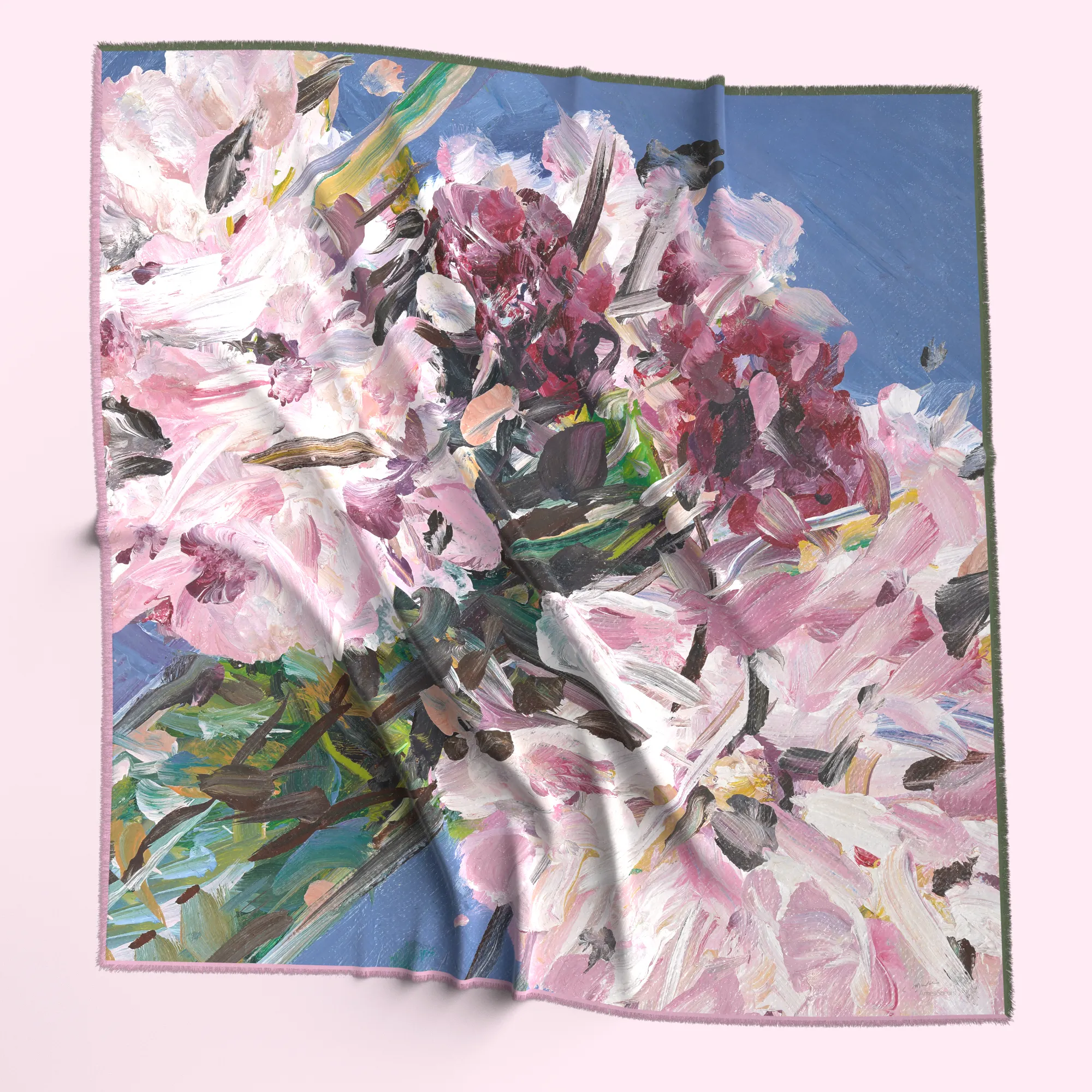 On retrouve ici la composition florale vibrante de l’œuvre originale de Clément Montolio . Cependant, sur cette matière en laine, soie et cachemire, les couleurs prennent une profondeur différente, plus mate et feutrée. Le bleu azur et les pivoines bordeaux se fondent dans la trame avec une élégance naturelle.