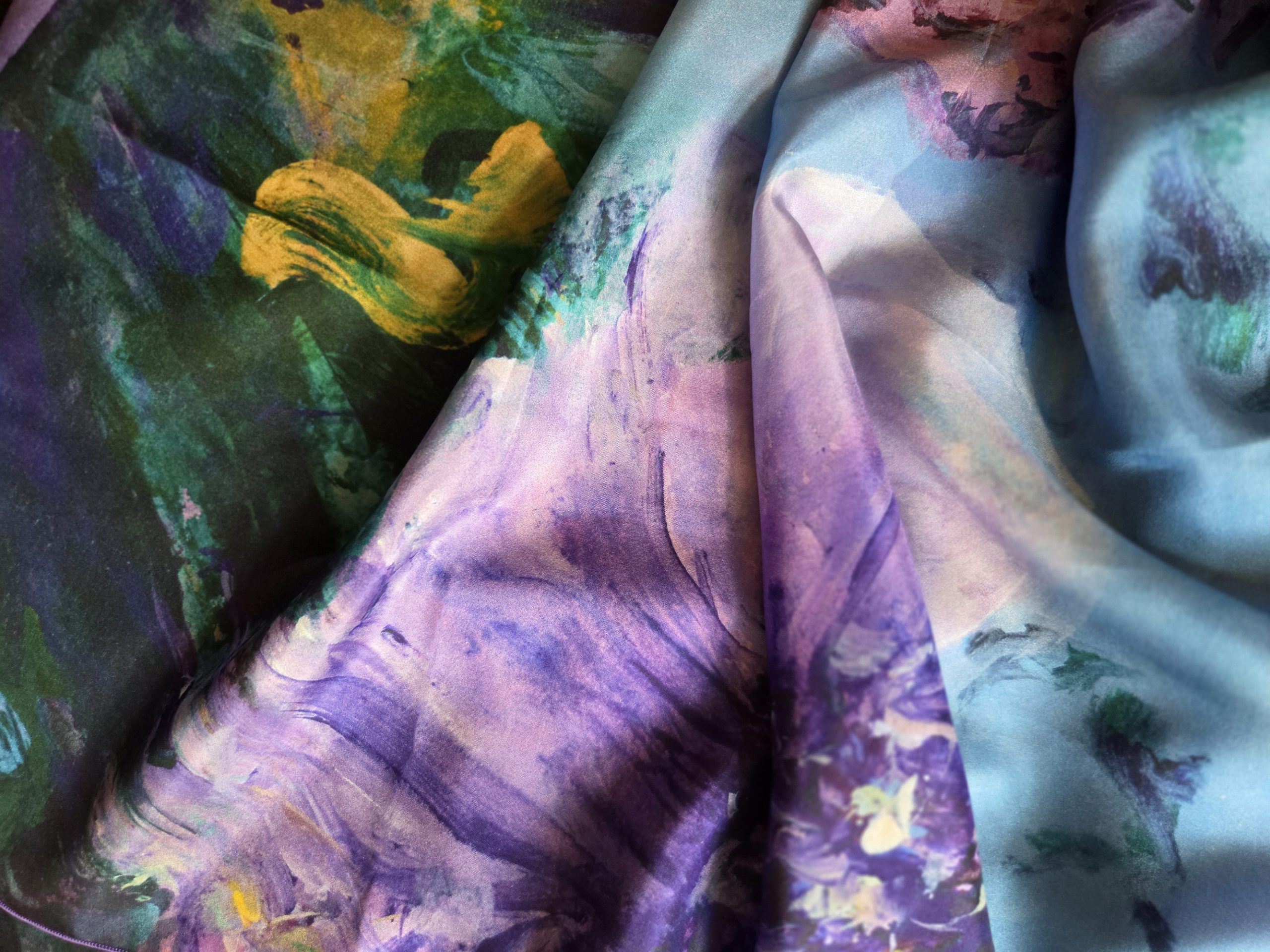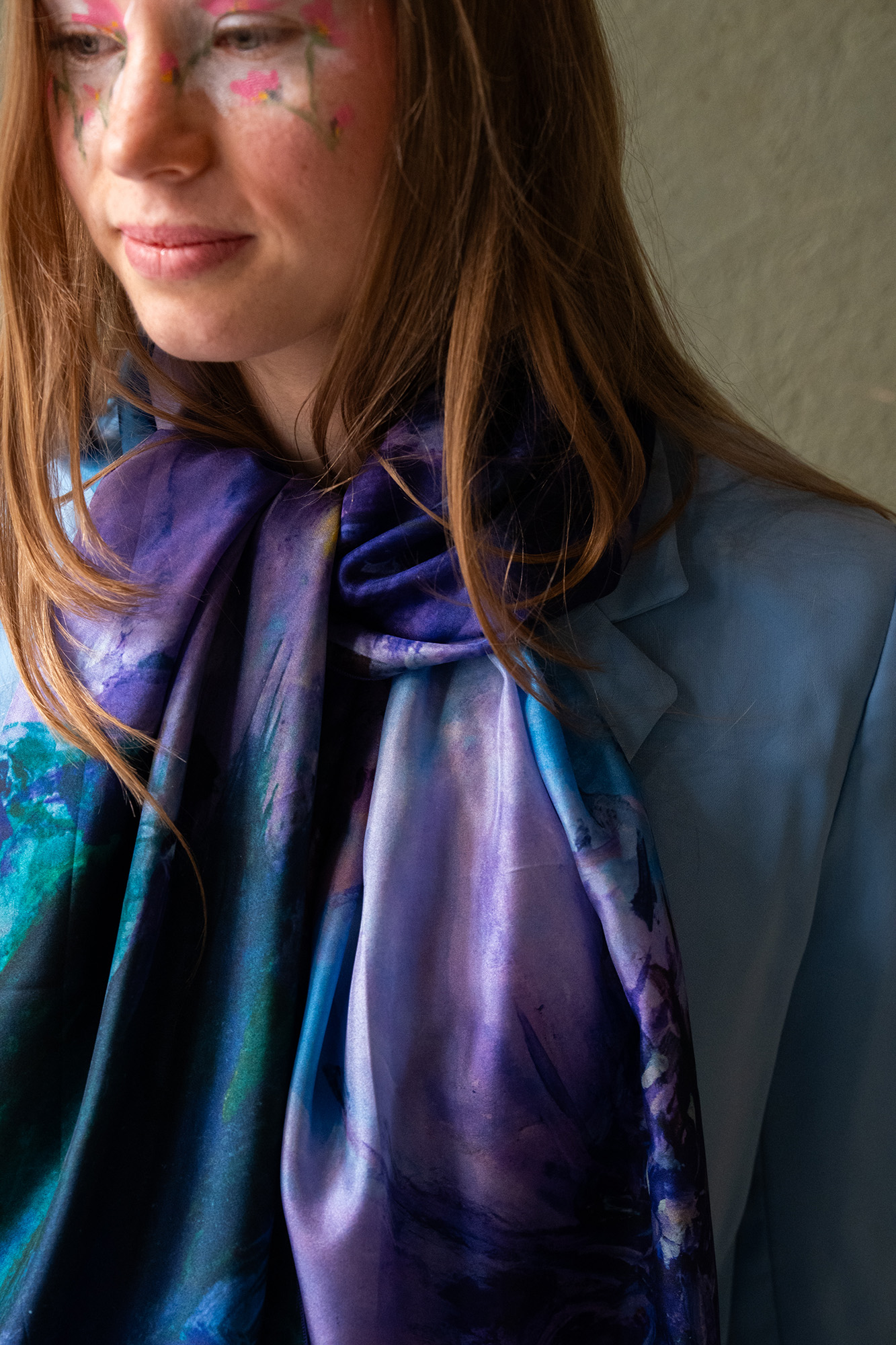 Ce format 180 cm et la légèreté du pongé permettent une multitude de jeux de drapés. Nouez-la de façon lâche pour laisser l’œuvre s’exprimer sur une veste sombre, ou enroulez-la plusieurs fois pour un effet « nuage » de couleurs autour du visage.